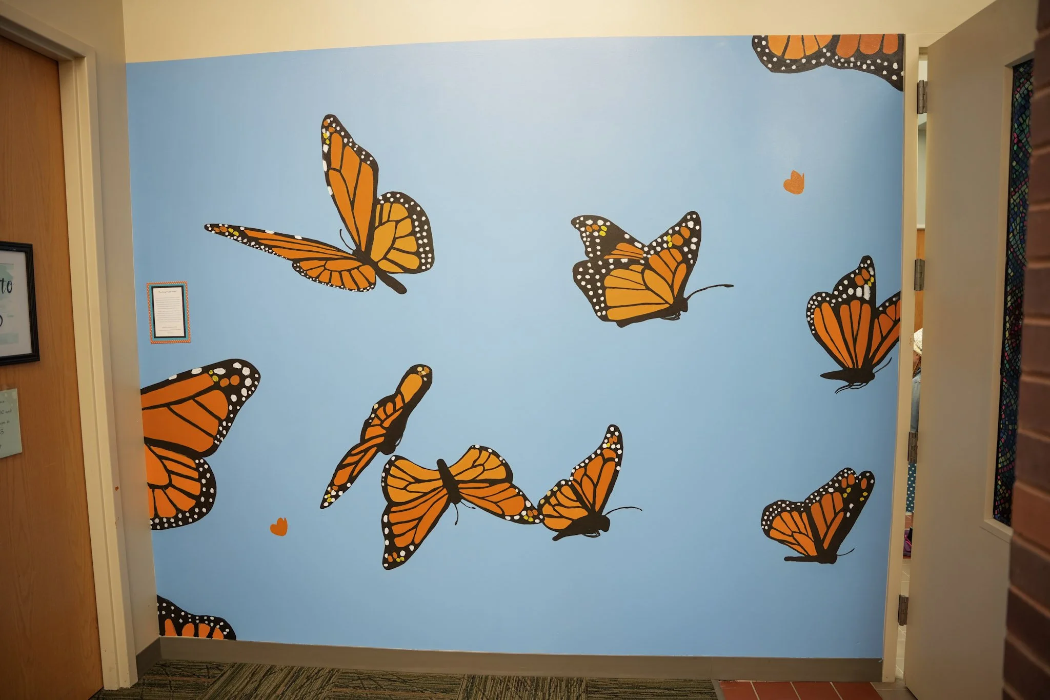 This mural depicts monarch butterflies in motion, capturing a quiet but powerful symbol of transformation, resilience, and healing. The monarch’s extraordinary migration—spanning thousands of miles and generations—mirrors the courage it takes to face mental health challenges and heal from inherited trauma.